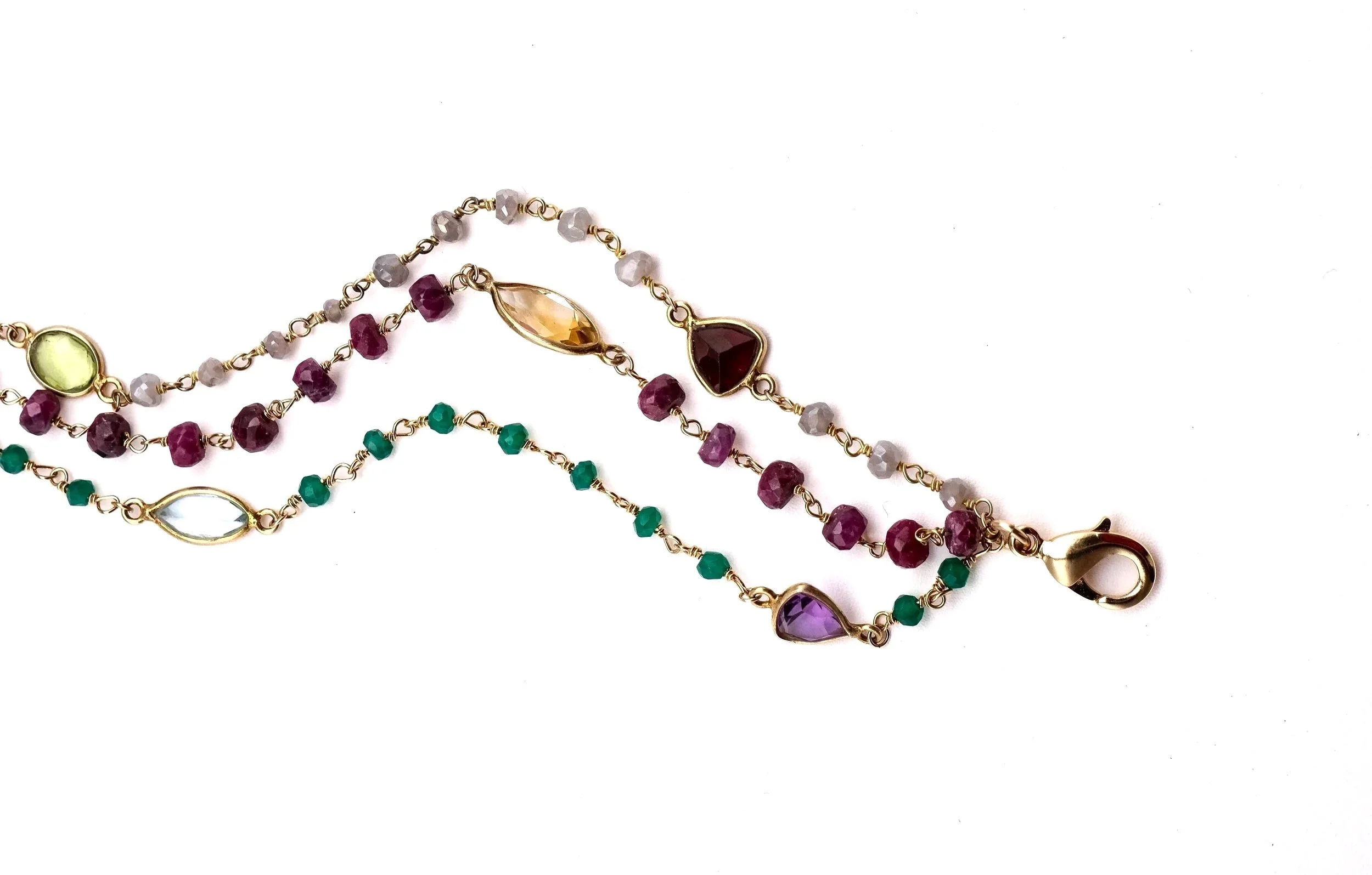 Gold, wire-wrapped quartzes, and multi-sapph